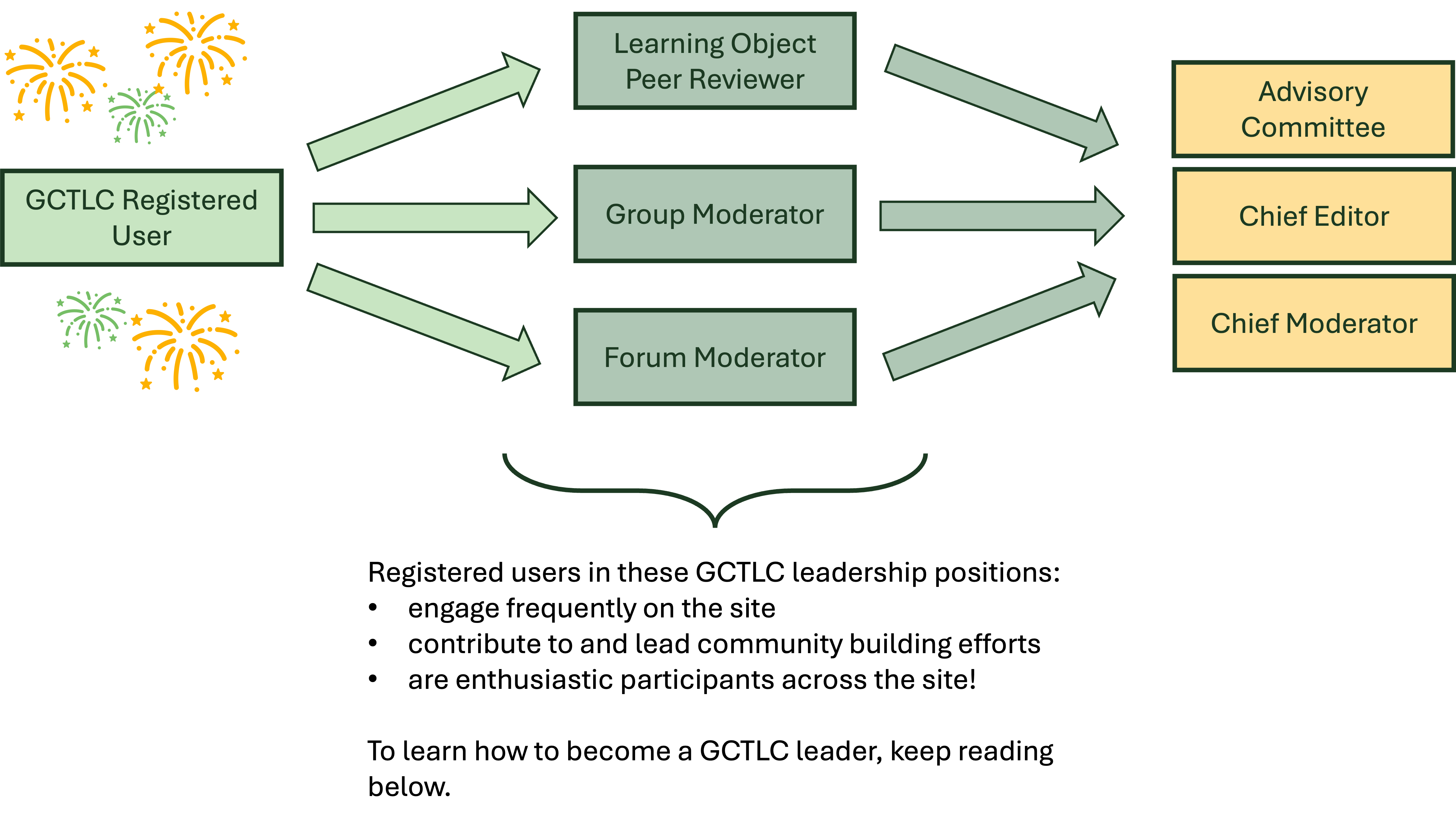 There are many ways to take on more leadership positions within the GCTLC! The flowchart below shows a few of the different roles available to community members, including peer reviewers and group and forum moderators. More experienced community members can apply to take on higher level positions, including Advisory Committee membership or even Chief Editor/Chief Moderator. More information is provided in the sections below.